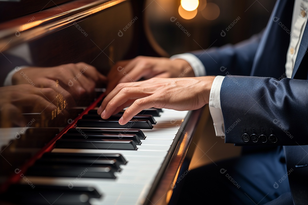 Um pianista tocando apaixonadamente uma peça clássica complexa