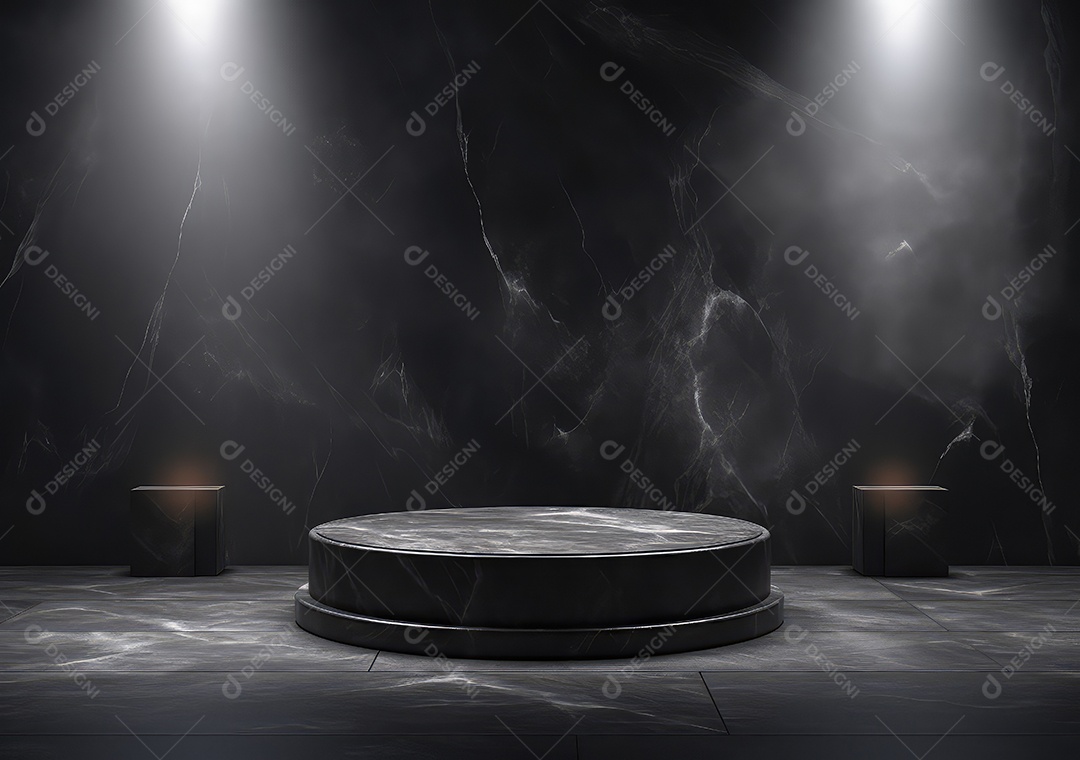 Pódio de pedra de mármore de produto vazio luxuoso e lea verde flor...