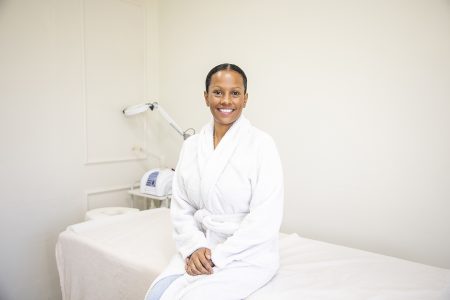 Mulher morena sorrindo na frente de um bac verde e amarelo brilhante.