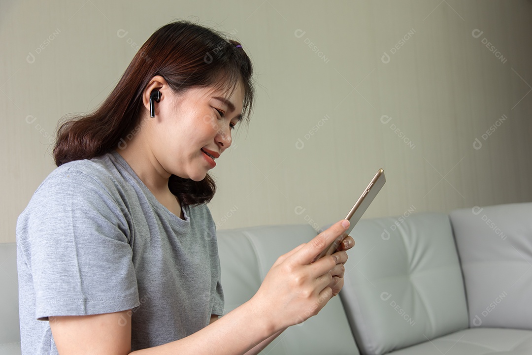 Jovem mulher asiática usa telefone celular Ligue para seus amigos ou familiares