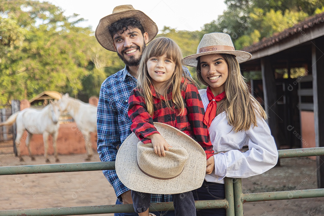 Pai e mãe ao lado de sua filha sobre uma fazenda