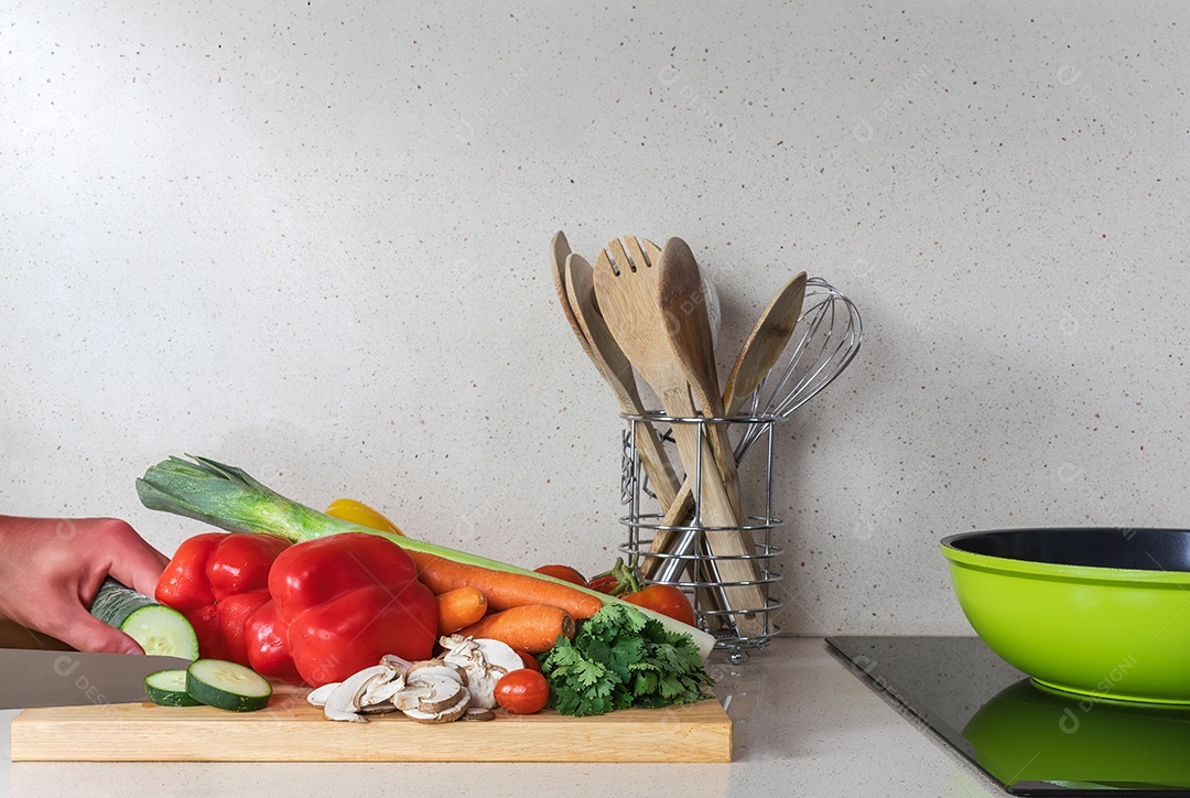 Pessoa cortando à mão diversos vegetais orgânicos crus na bancada d...