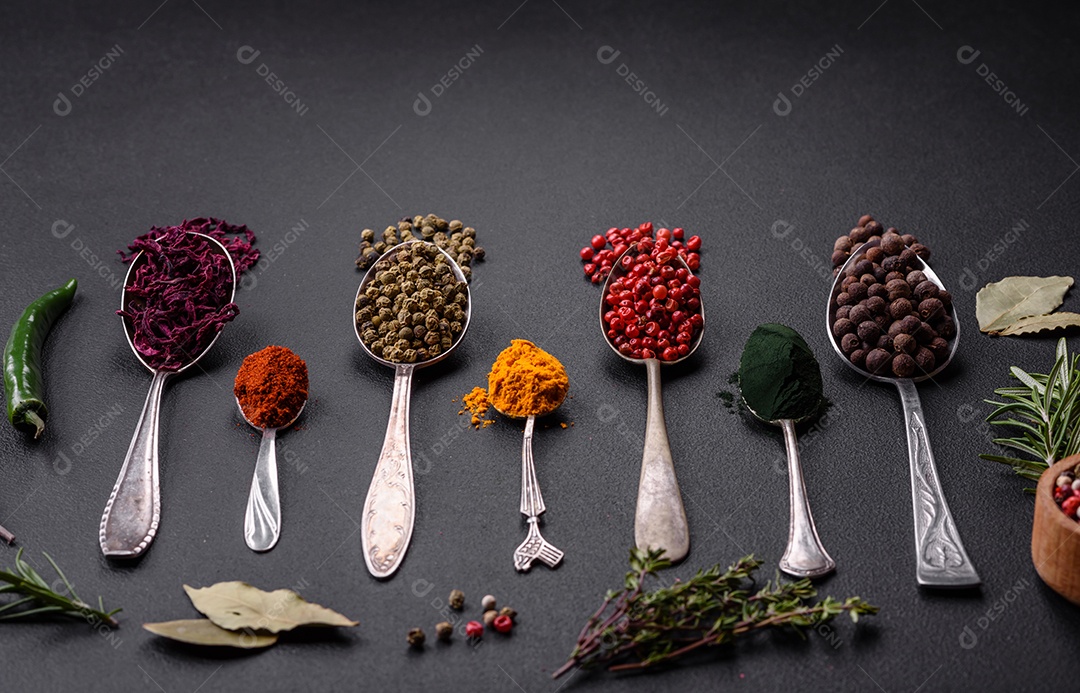 Vários tipos de especiarias em colheres de metal páprica, tomate, curry