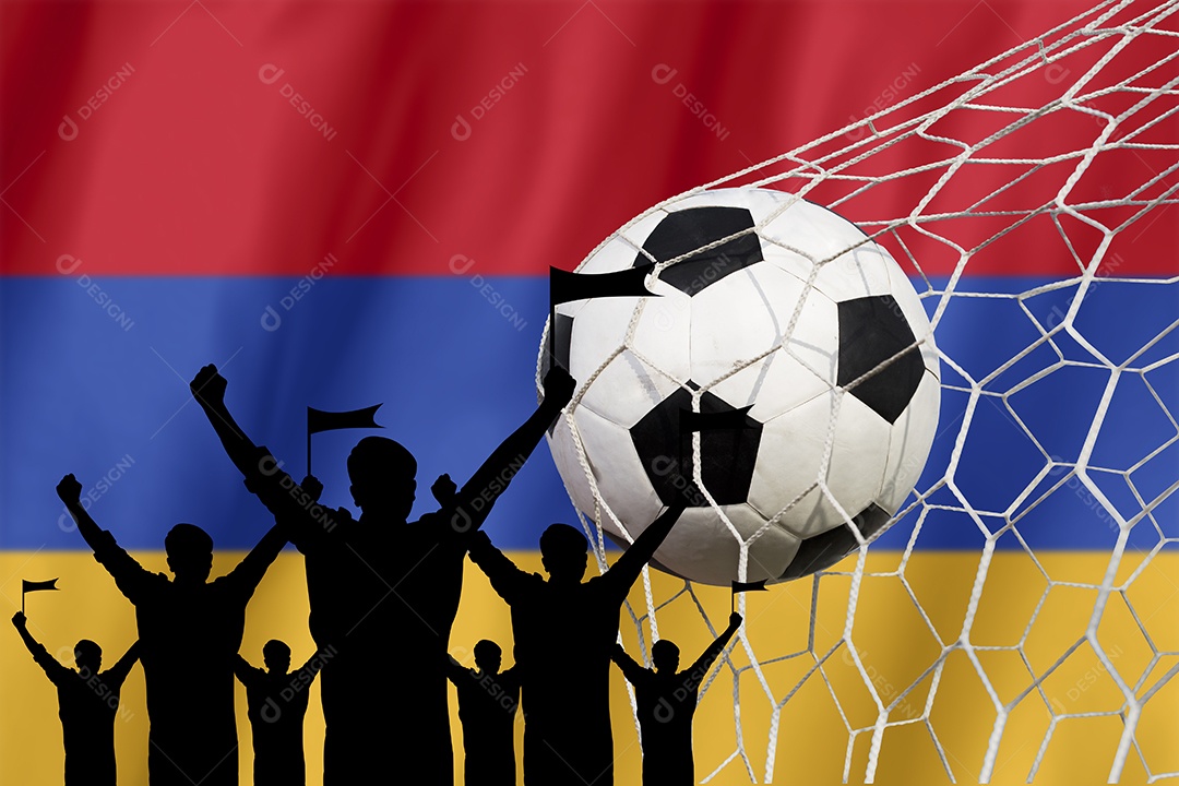 Silhuetas de fãs de futebol com bandeira da Armênia.