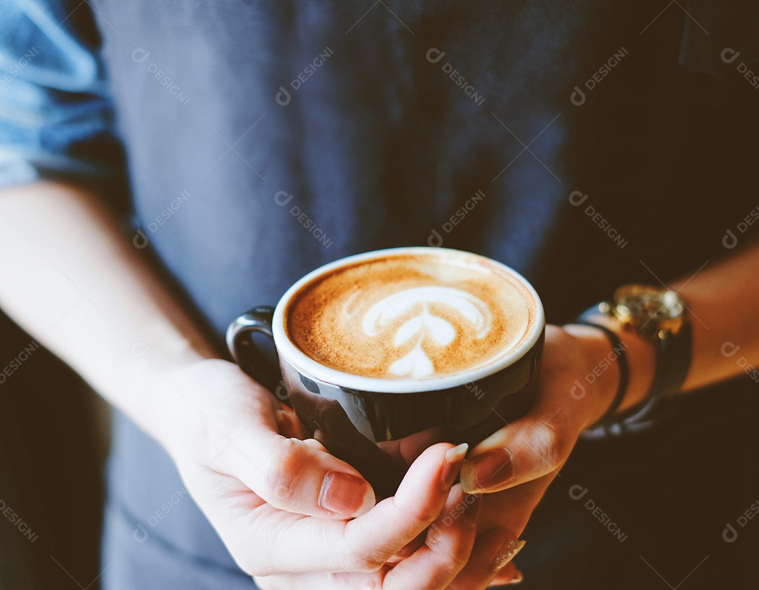 Feche as mãos da mulher barista segurando uma xícara de cappuccino ...