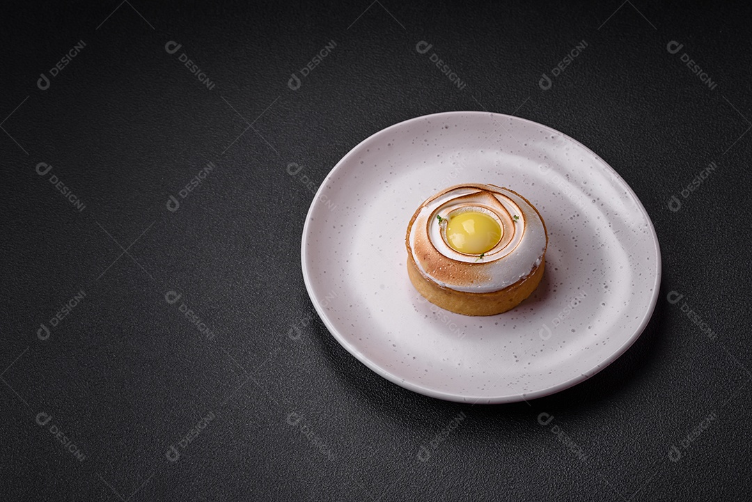 Deliciosa torta com recheio cítrico e creme de nozes sobre fundo de...