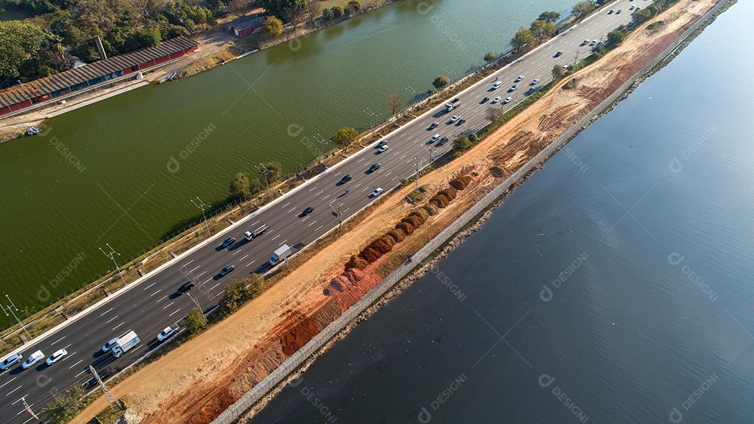 Vista da Marginal Pinheiros com o rio Pinheiros e prédios modernos ...