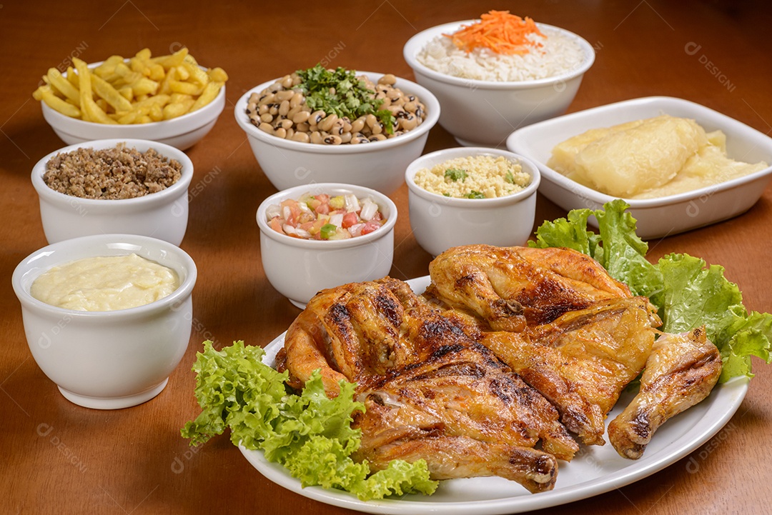 Frango assado com acompanhamentos em fundo de madeira. culinária brasileira.