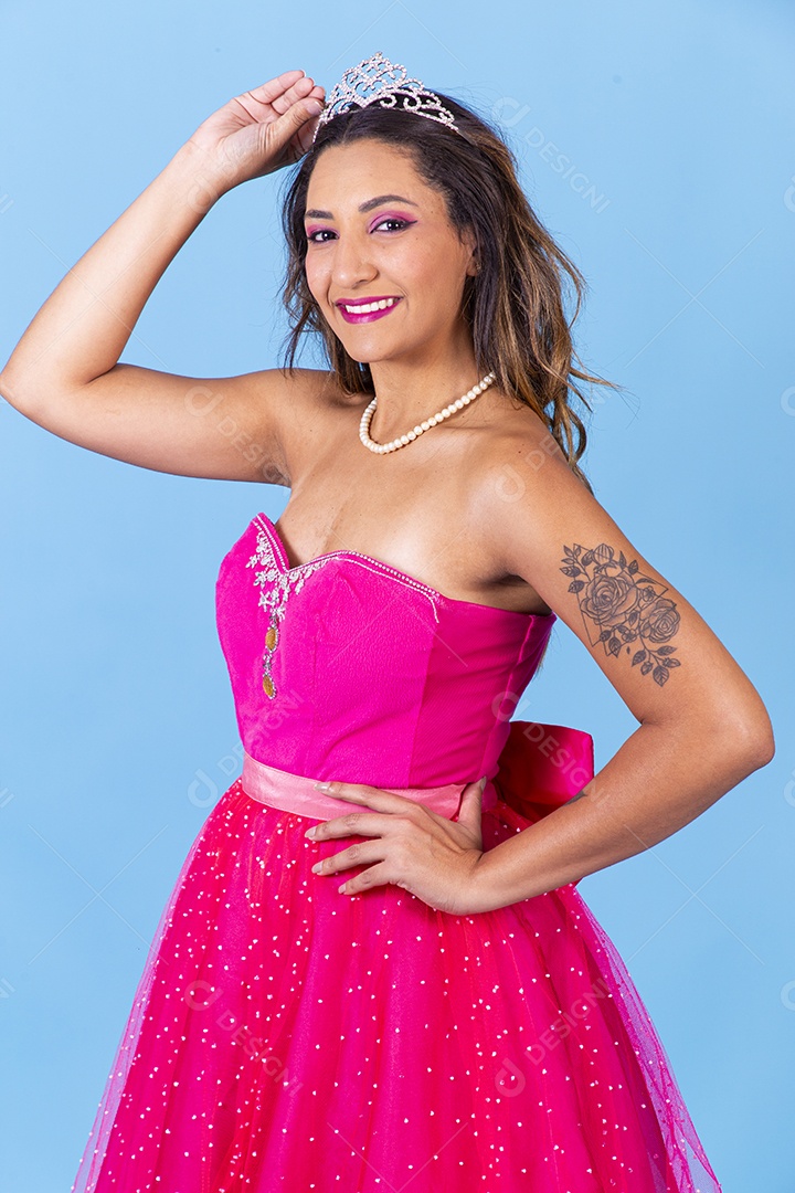Linda mulher jovem sorridente usando vestido rosa fundo isolado