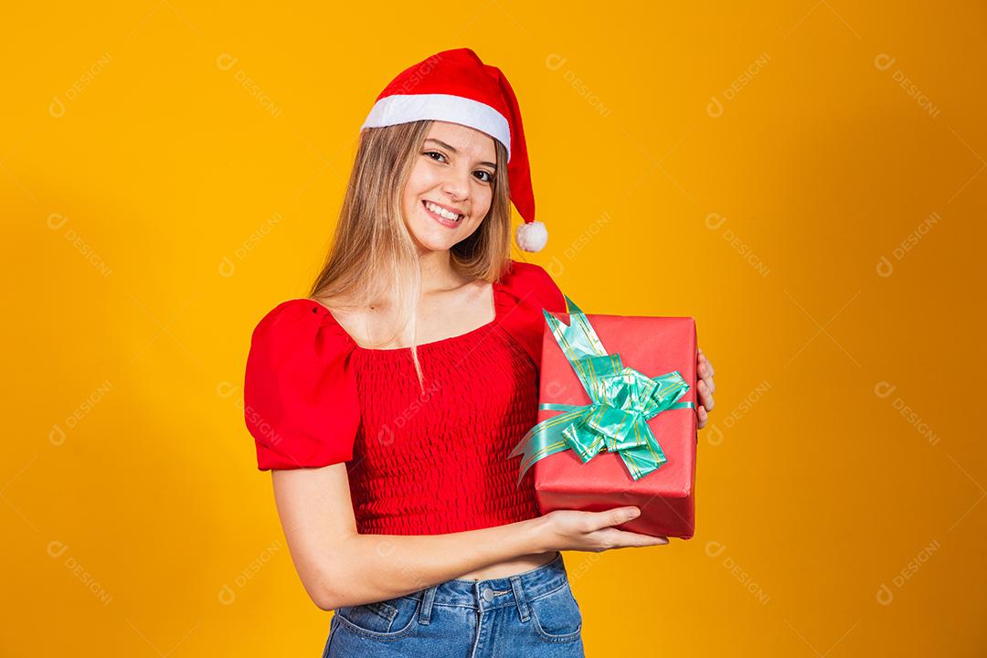 Mulher excitada sorridente com roupa de papai noel vermelha segurando presente de natal em seu ouvido isolado no fundo amarelo
