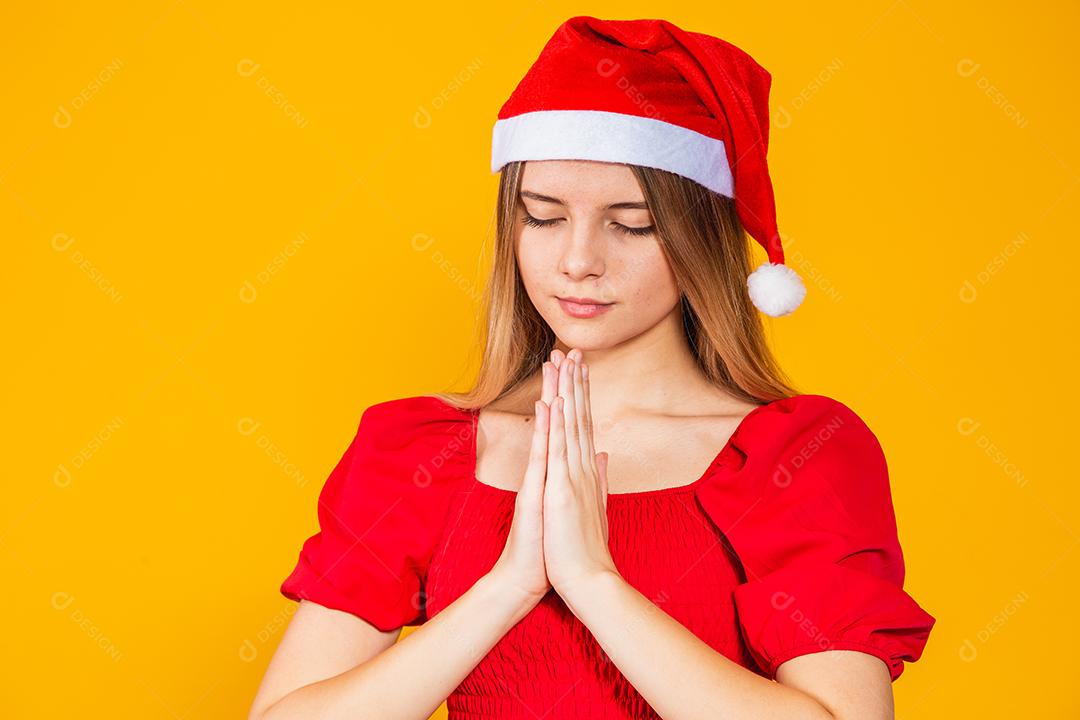 Jovem mulher bonita usando chapéu de Papai Noel Natal sobre fundo amarelo isolado, rezando com as mãos juntas