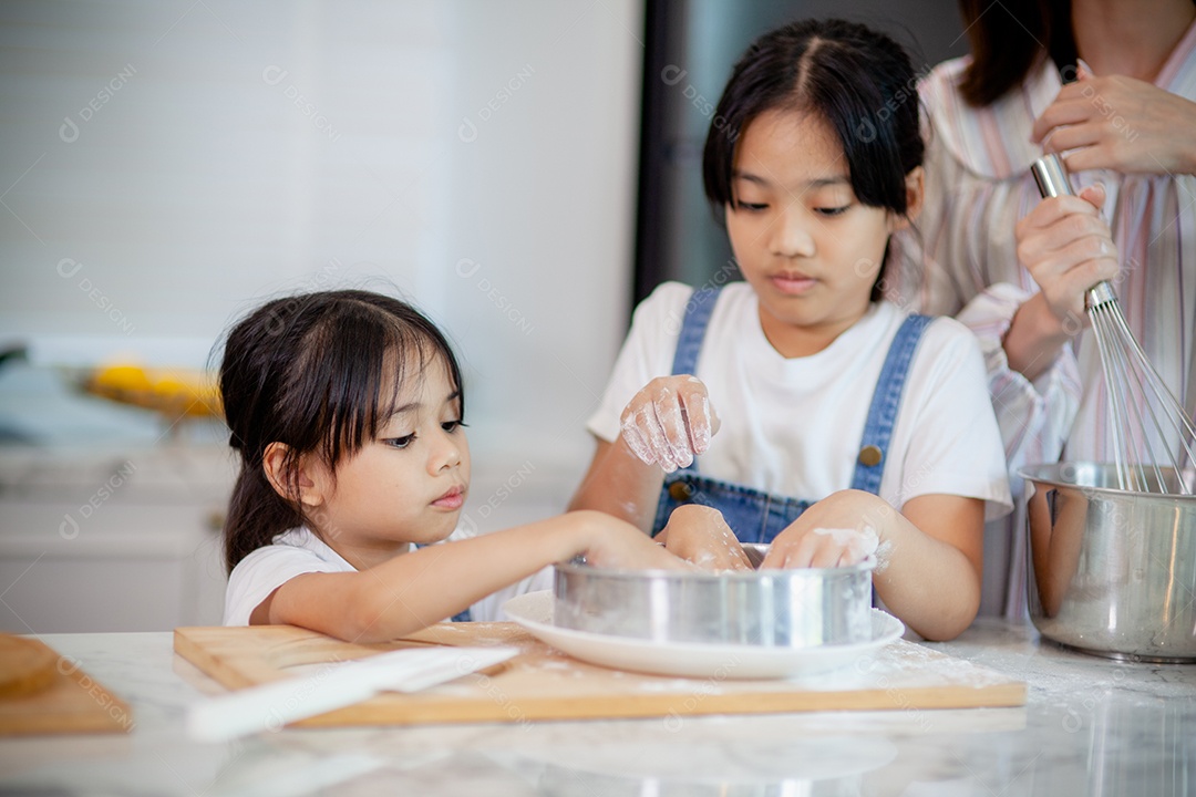 Duas meninas asiáticas bonitas, aprendendo a fazer pão e padaria com um sorriso curioso e feliz. Ela aprende e brinca