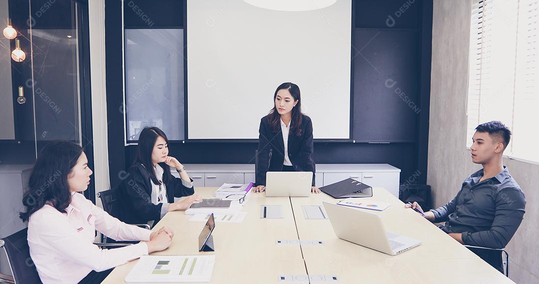 Empresários asiáticos e grupo usando notebook para reuniões sérias sobre o trabalho
