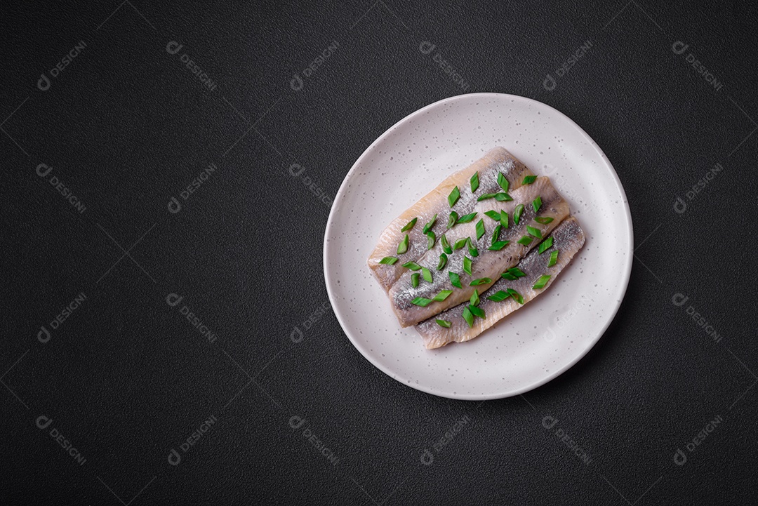 Delicioso arenque do Atlântico marinado com sal e especiarias em óleo sobre um fundo escuro de concreto