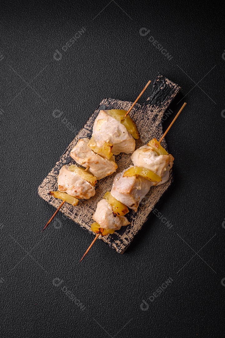 Delicioso kebab de frango ou peru com pedaços de abacaxi em espetos com sal, especiarias e ervas em um fundo escuro de concreto