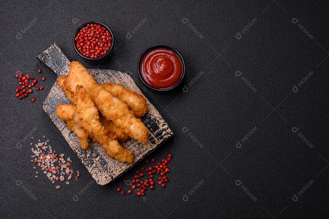 Deliciosas tiras de frango ou peru fresco ou nuggets empanados com sal e especiarias sobre um fundo escuro de concreto