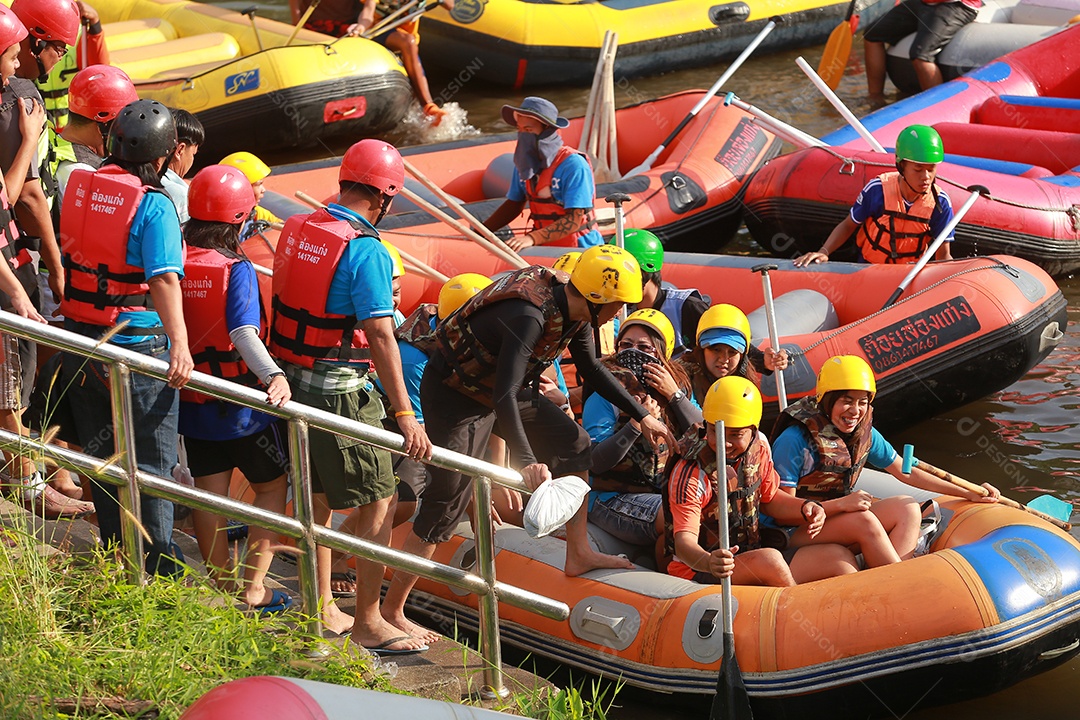 Grupo de aventureiro fazendo rafting na represa o rio é popular por sua vista panorâmica da natureza.
