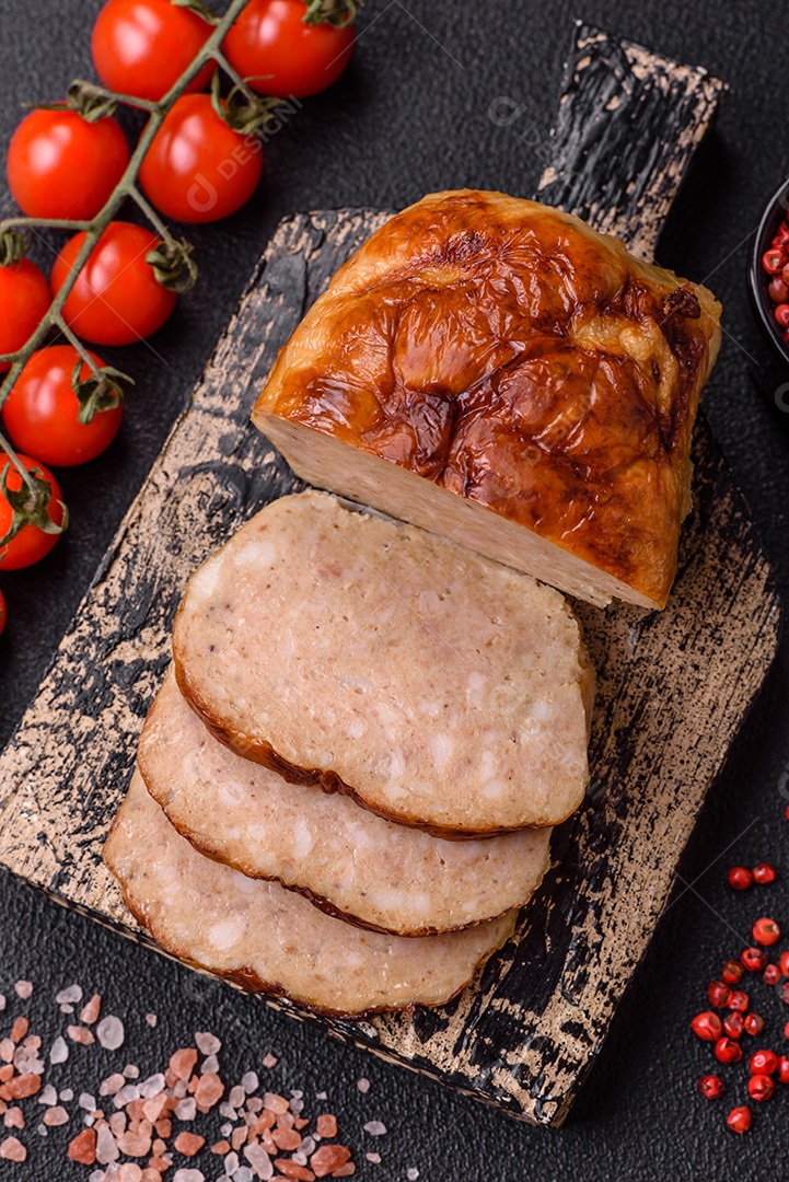 Rolo delicioso ou linguiça de frango picada caseira com sal, especi...