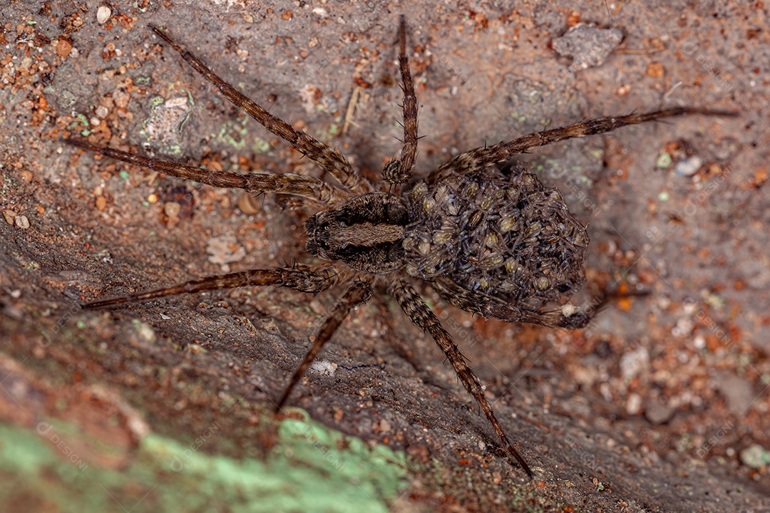 Aranha-lobo fêmea adulta da família Lycosidae carregando seus filhotes no abdômen