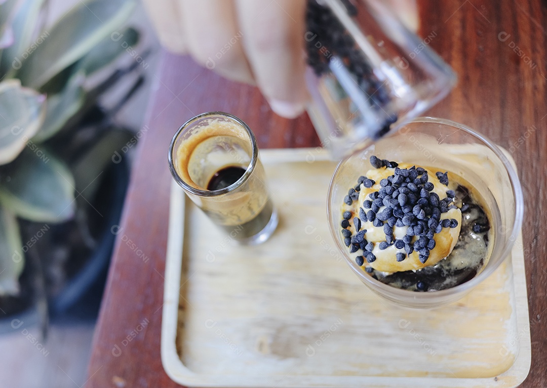 Derramando lascas de chocolate à mão para cobrir o sorvete