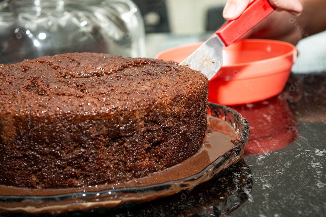 Cortando uma fatia de bolo de chocolate sobre um fundo escuro de mármore