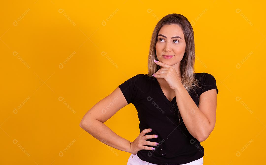 Mulher linda jovem com a expressão pensativa mãos no queixo sobre um fundo isolado amarelo