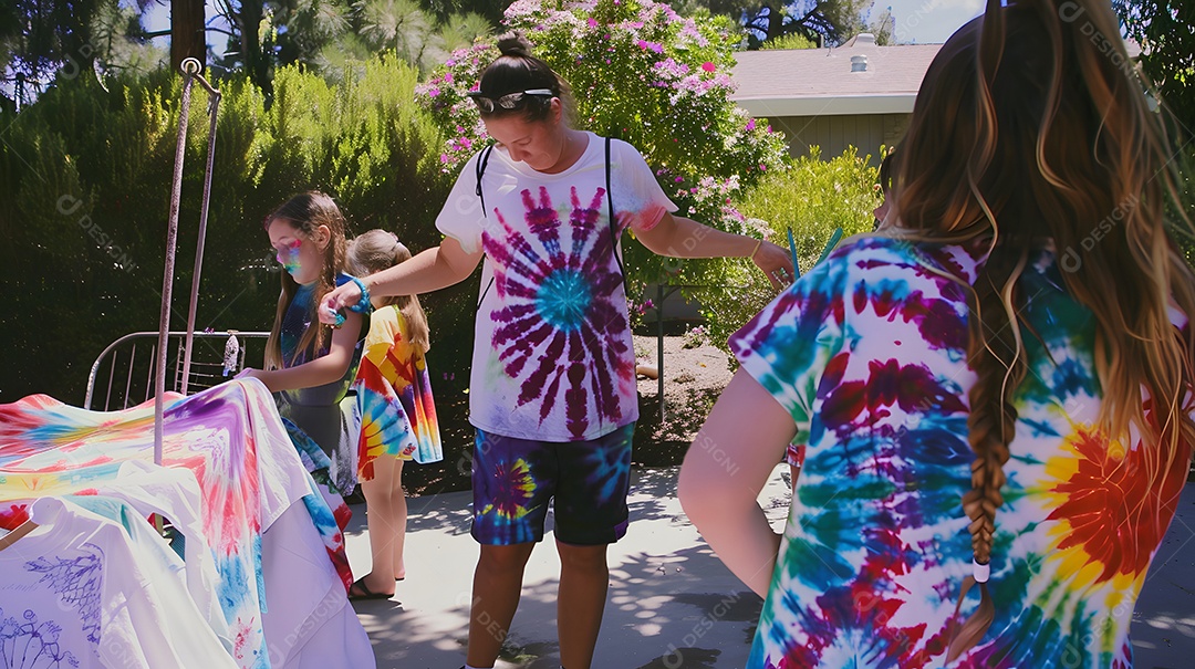 Crianças e seu instrutor gostam de criar camisas coloridas tie-dye