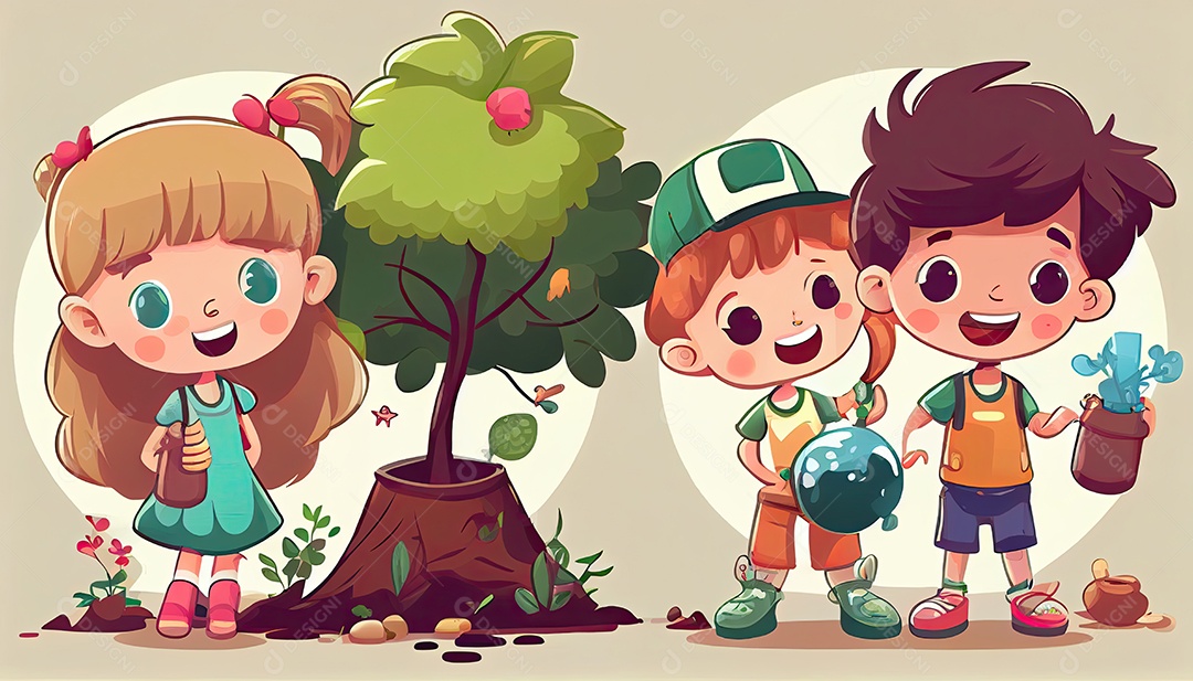 Crianças dos desenhos animados plantando árvores Dia da Terra a importância de amar a natureza
