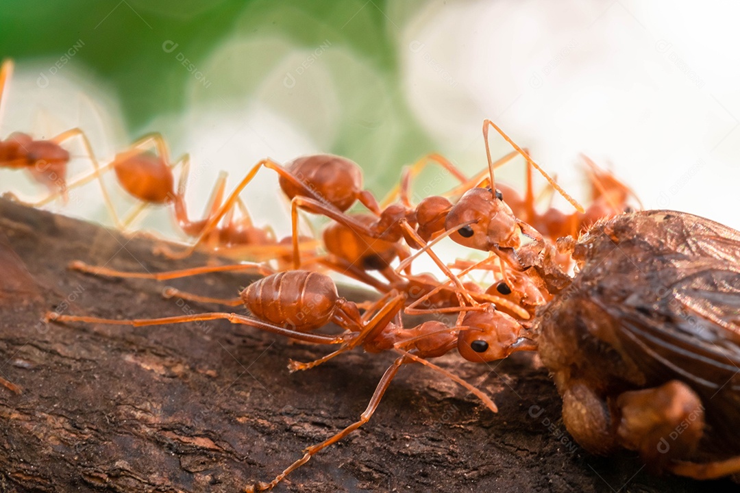 Formiga vermelha, ação ajudando a comida no galho grande árvore, no...