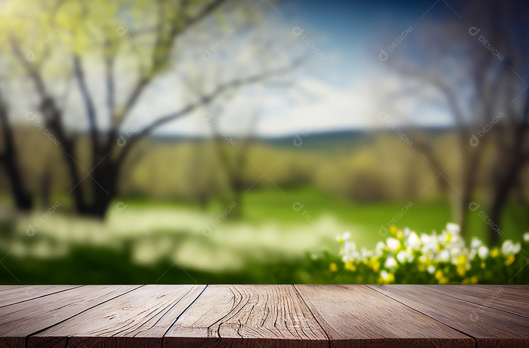 Mesa de madeira vazia abstrata com espaço de cópia sobre fundo desfocado de primavera e verão