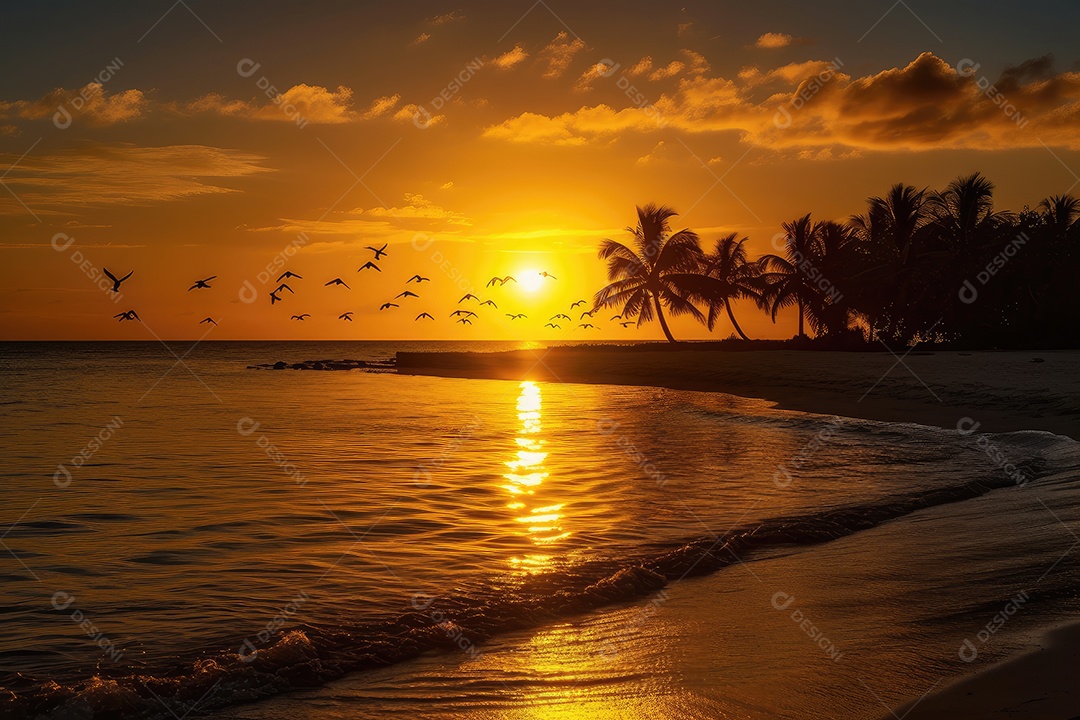 Pontando sol sobre o mar calmo, praia tranquila. As cores douradas ...