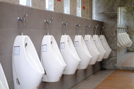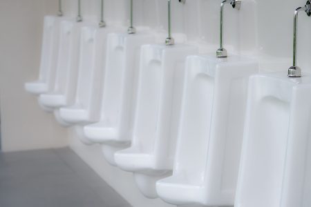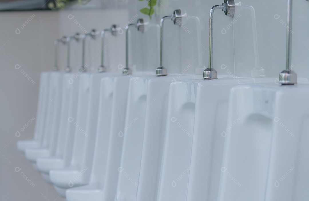 Mictórios brancos em banheiro público masculino.