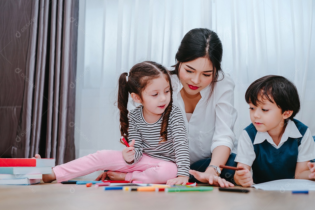 Jardim de infância e pré-escola Crianças e professora ou mãe ajudando filho e filha desenhando
