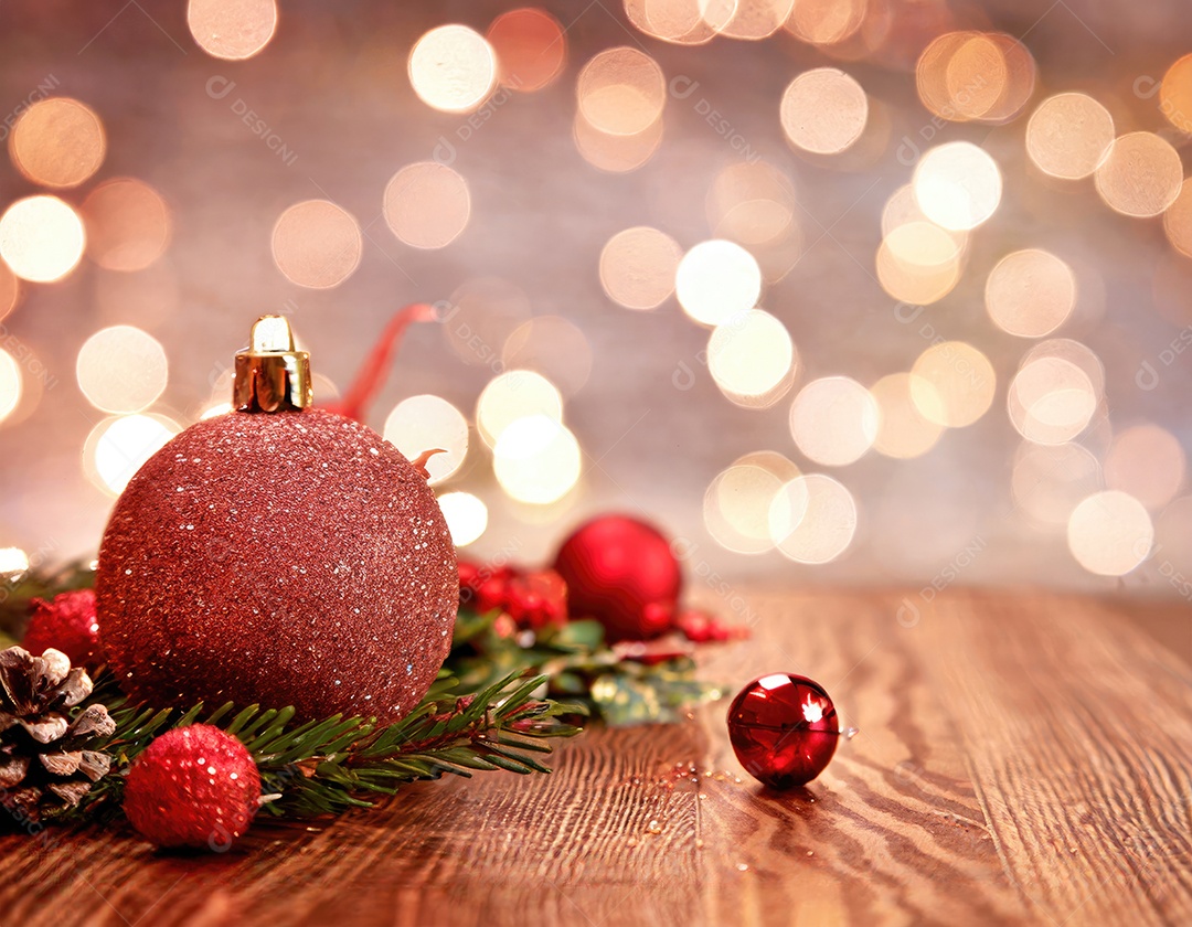 Brinquedo de árvore de Natal de Ano Novo, galhos de uma árvore de Natal, decorações de Ano Novo em um fundo de madeira.