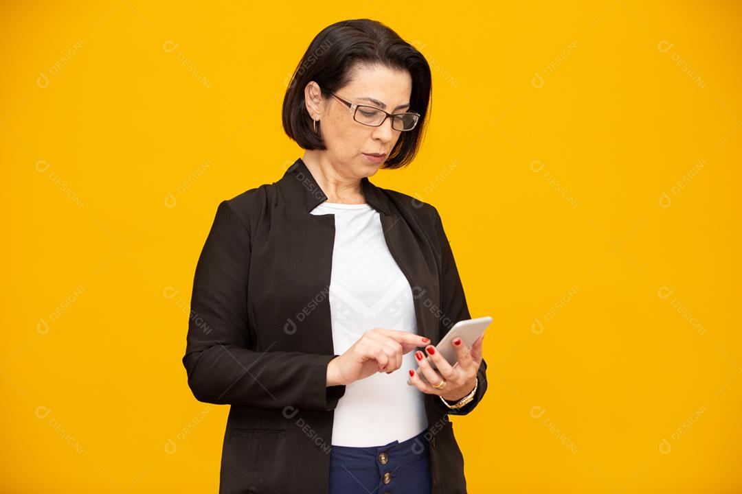 Foto de uma empresária madura atraente trabalhando com seu telefone celular