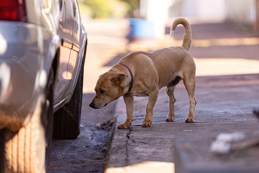 Cão mamífero animal na calçada farejando para fazer xixi marcando território