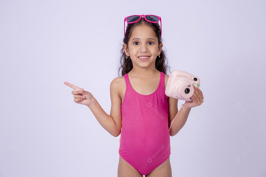 Linda garotinha sorridente com óculos de sol e maiô rosa