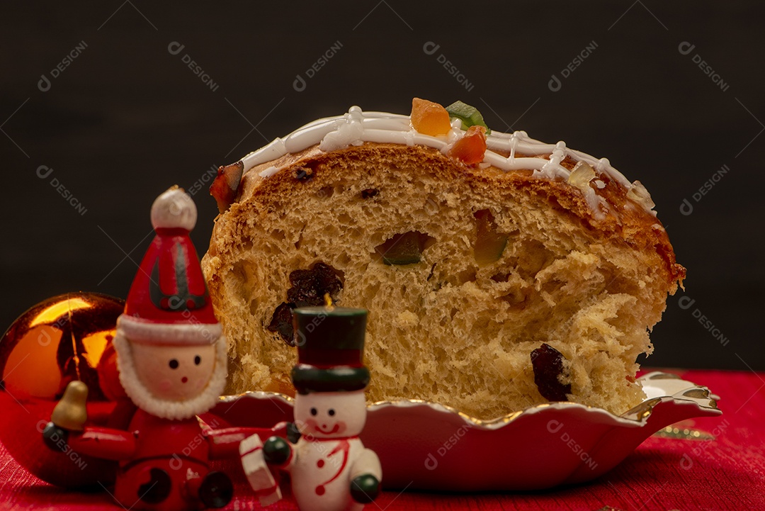 Panetone coberto com frutas cristalizadas e calda de chocolate branco