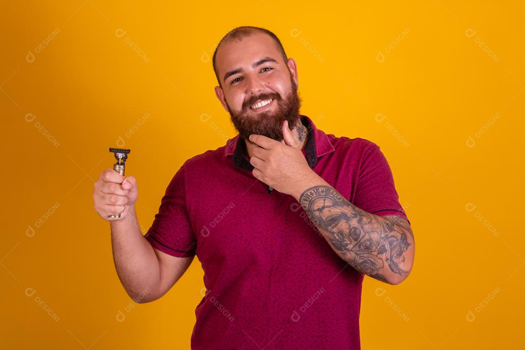 homem ruivo de barba usando uma camisera vermelha se barbeando