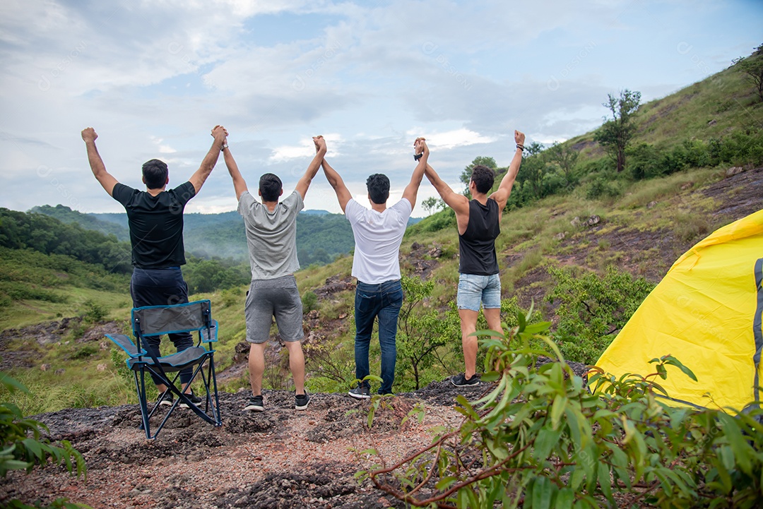 Grupo de amigos do sexo masculino fica de pé e aprecia a vista e re...