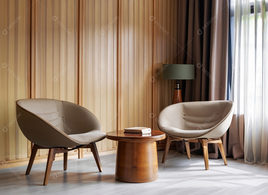 Duas cadeiras cilíndricas e mesa de centro redonda de madeira contra a janela perto do painel