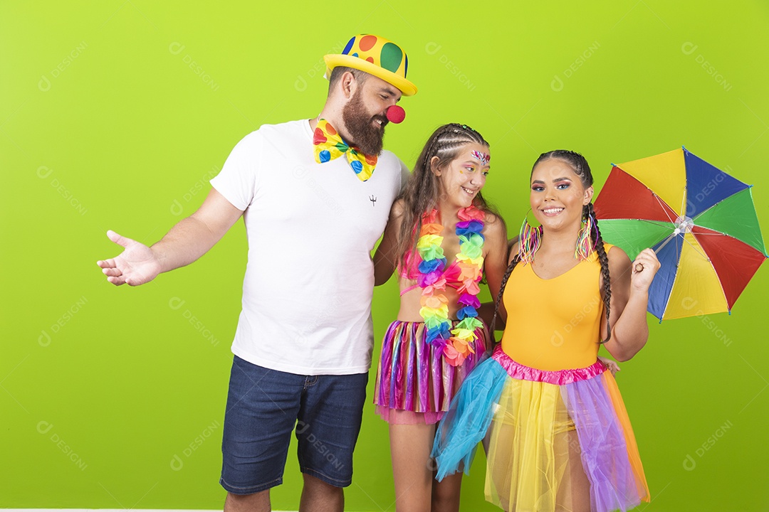 Pai e Mãe e filha usando fantasias de carnaval sobre fundo isolado
