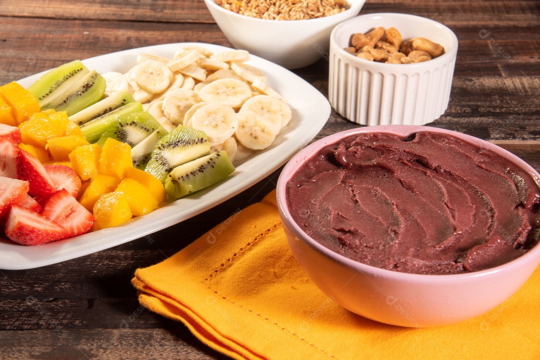 Açaí brasileiro em tigela acompanhado de frutas tropicais