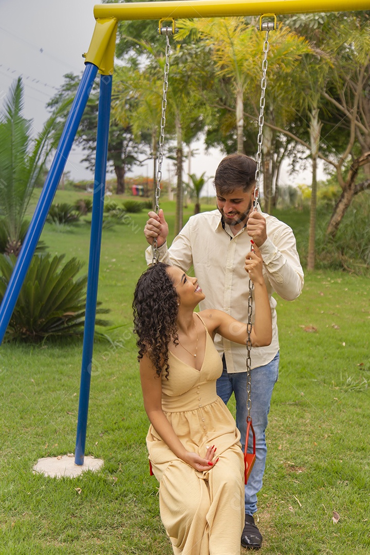 Lindo casal de homem e mulher apaixonado sobre parque