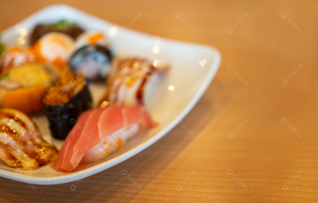 Vários sushi em um prato branco colocado sobre uma mesa de madeira.