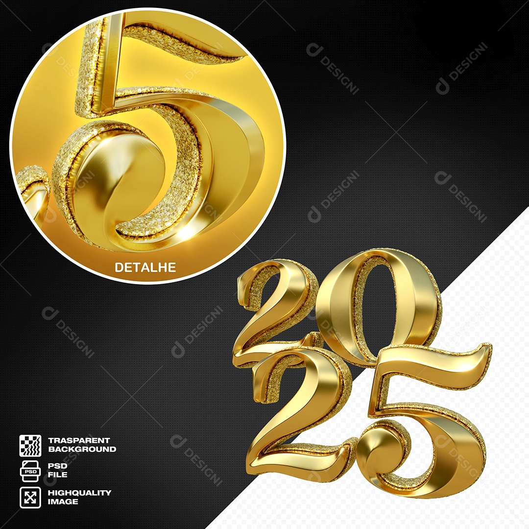 Elemento 3D Número 2025 Dourado de Ano Novo para Composição PSD