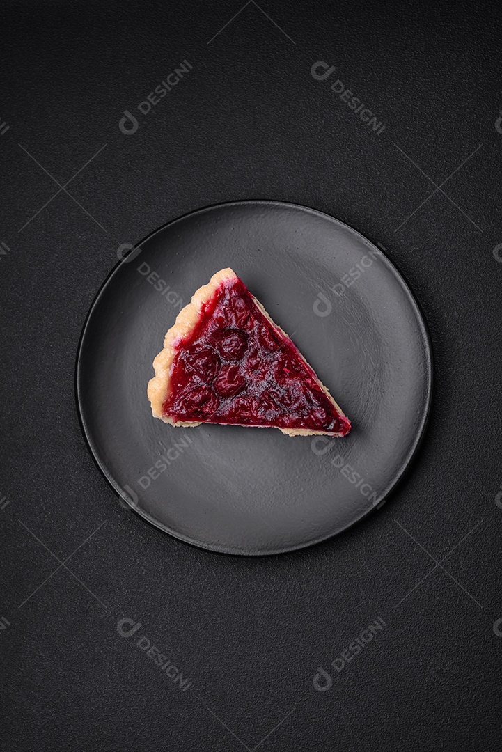 Deliciosa torta doce perfumada com bagas de cereja em uma placa de cerâmica sobre um fundo escuro de concreto