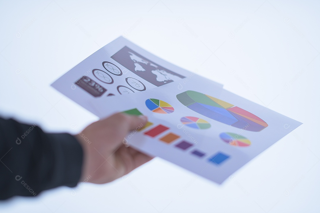 Mão de empresário segurando um documento. Fundo branco de cenas.