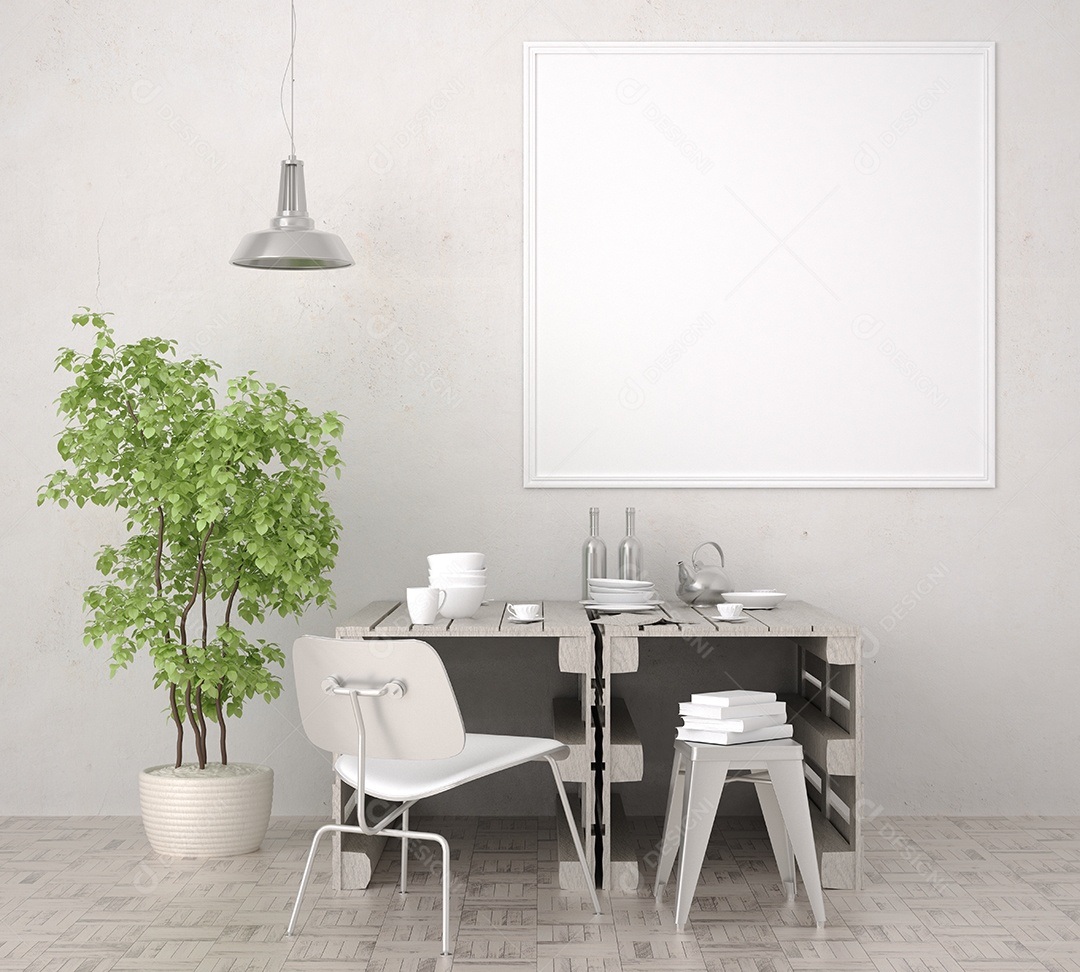 Placa grande de maquete de ilustração 3D com moldura na sala de jantar em casa ou restaurante, cores pastel interiores de estilo escandinavo