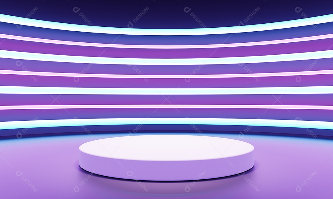 Vitrine de pódio de produtos de ficção científica cyberpunk com fundo azul roxo e rosa. Conceito de tecnologia e objeto. Renderização de ilustração 3D.